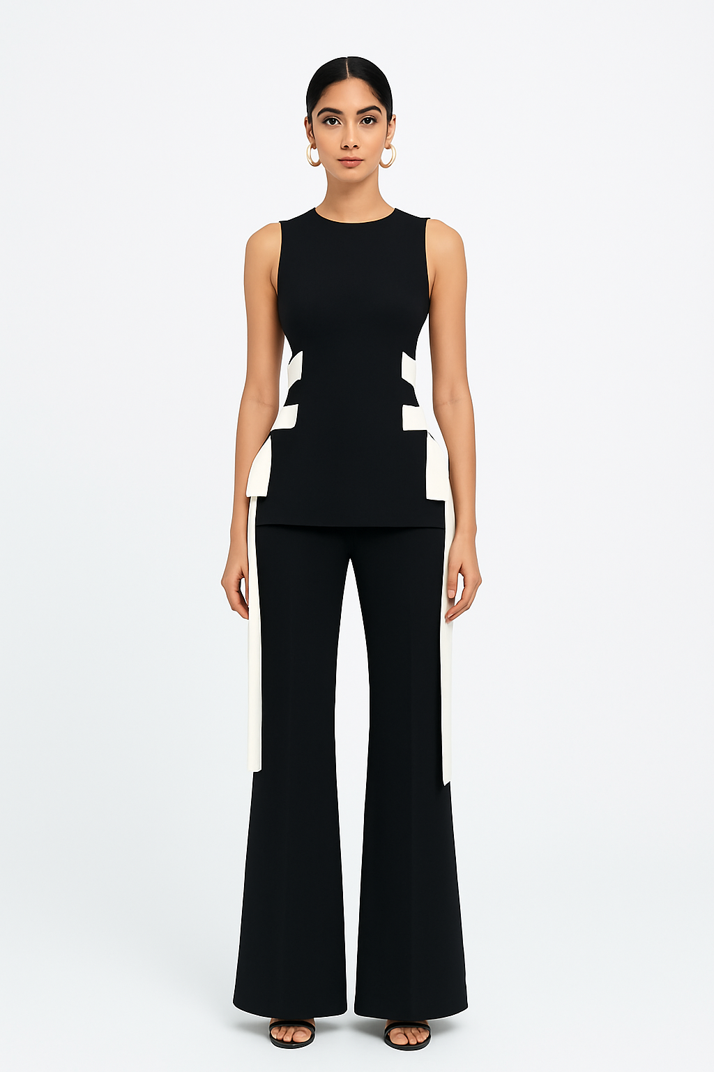 Paired with high-waisted flared trousers featuring a secure zip closure, this set delivers a long, flattering silhouette with effortless movement.