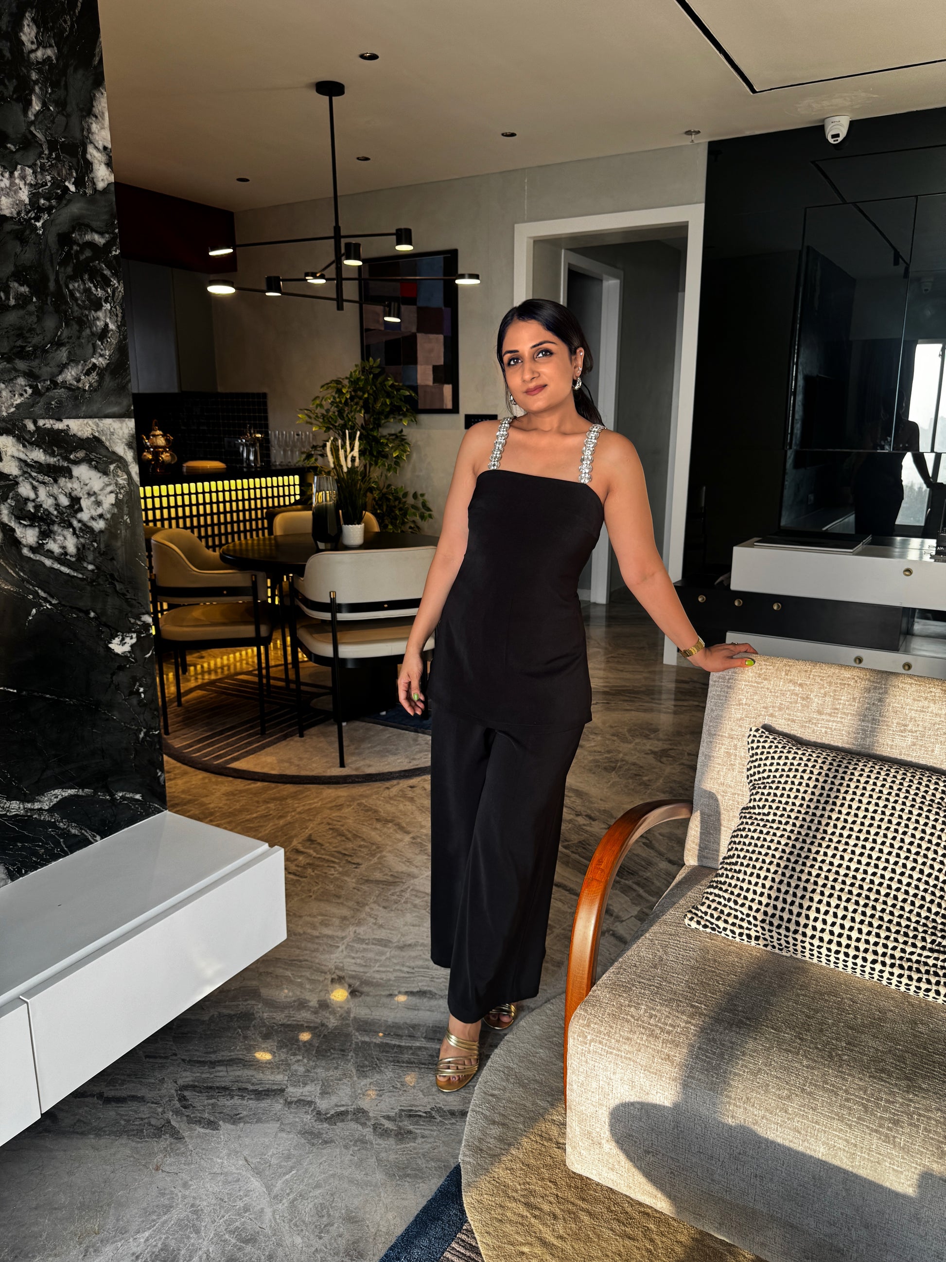 Turn heads this festive season in our black Armani lachka co-ord set, designed for comfort with a touch of glam. The straight short kurta-style top features embellished straps and back tie-ups to perfectly cinch your waist for a flattering fit. Paired with high-waisted flared pants in a slightly elasticated premium fabric, this look blends sophistication with ease.